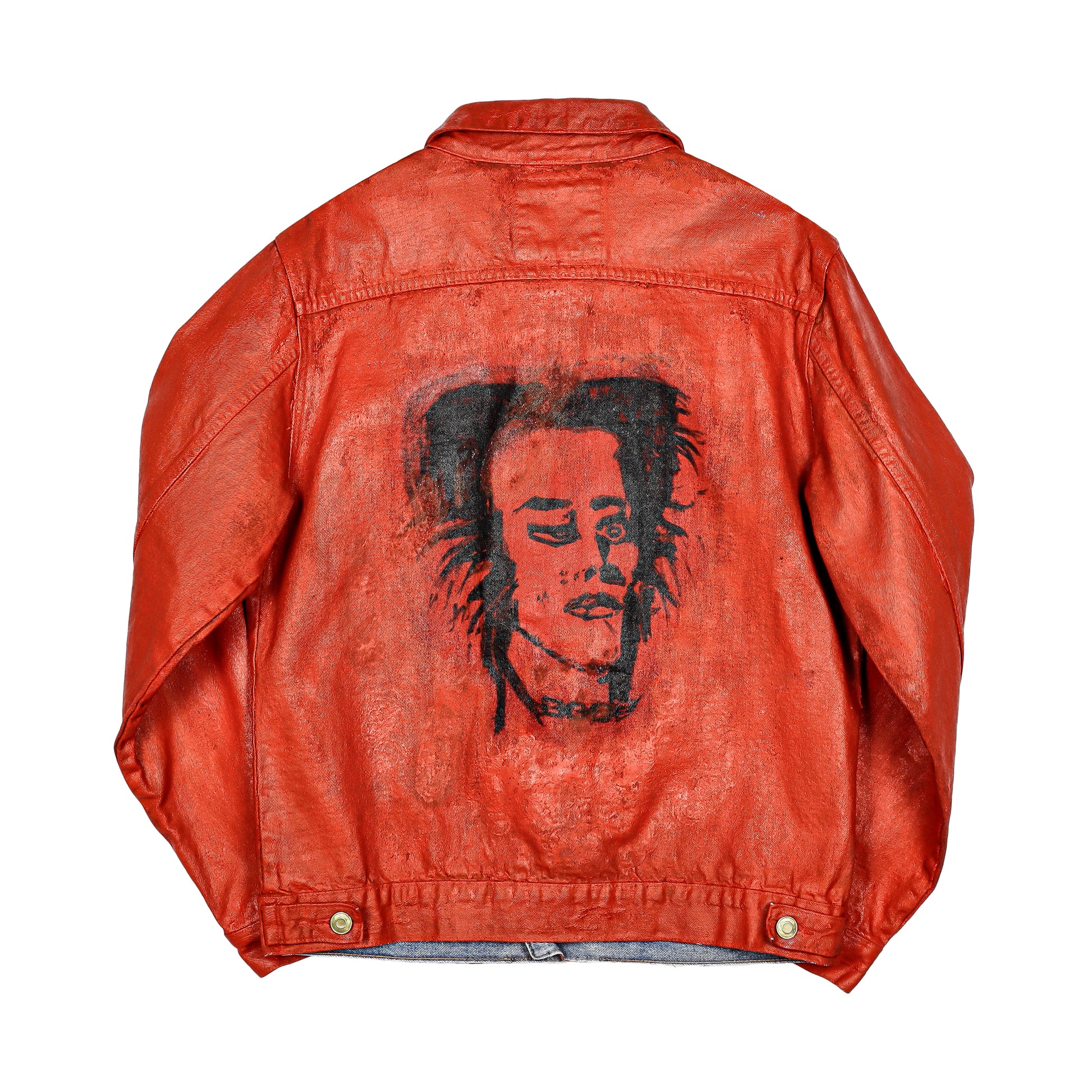 chaqueta de denim. posee botones metálicos. pintura textil roja aplicada a mano en múltiples capas; permanente, no removible. arte en espalda pintado a mano. interior en denim original sin intervenir. pieza única 1:1. trabajo realizado en CHILE.